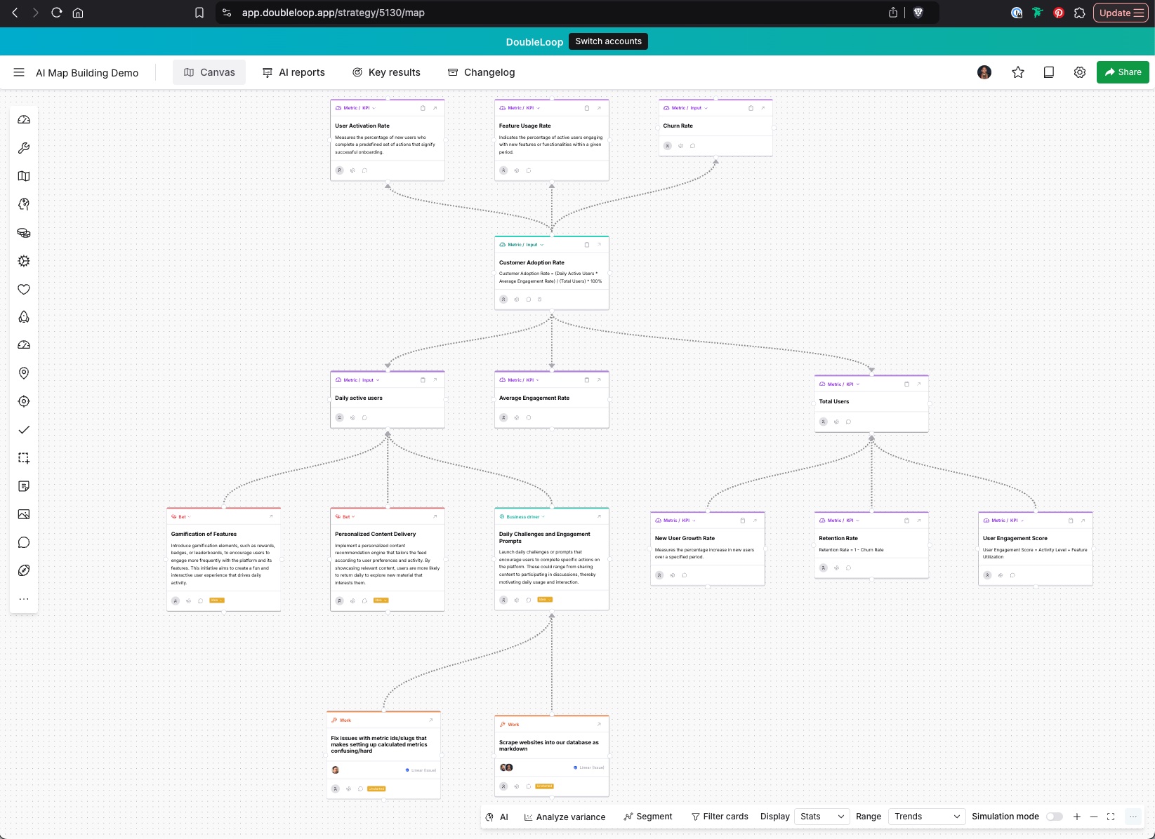 A first version of our AI Reporting Dashboard that can use the full context of the strategy map to generate reports. This is useful for staying on top of trends in your data, anomaly detection, and a myriad of other usecases.
